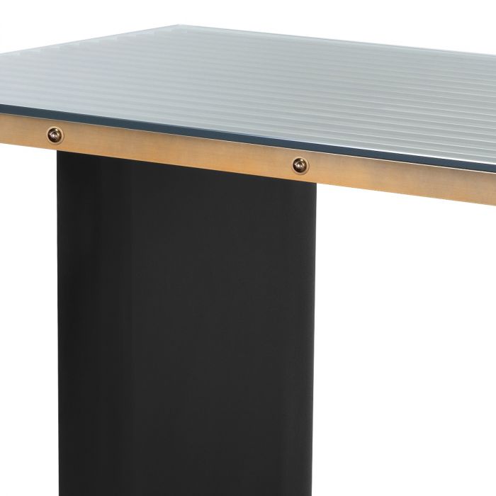 Fall for the graphic appeal of the Vauclair desk. Smooth and sleek, this writing table is a perfect addition to a modern, contemporary or industrial interior. It features a thick clear glass tabletop resting on a metal trellis with a brushed brass finish and a solid black base.
