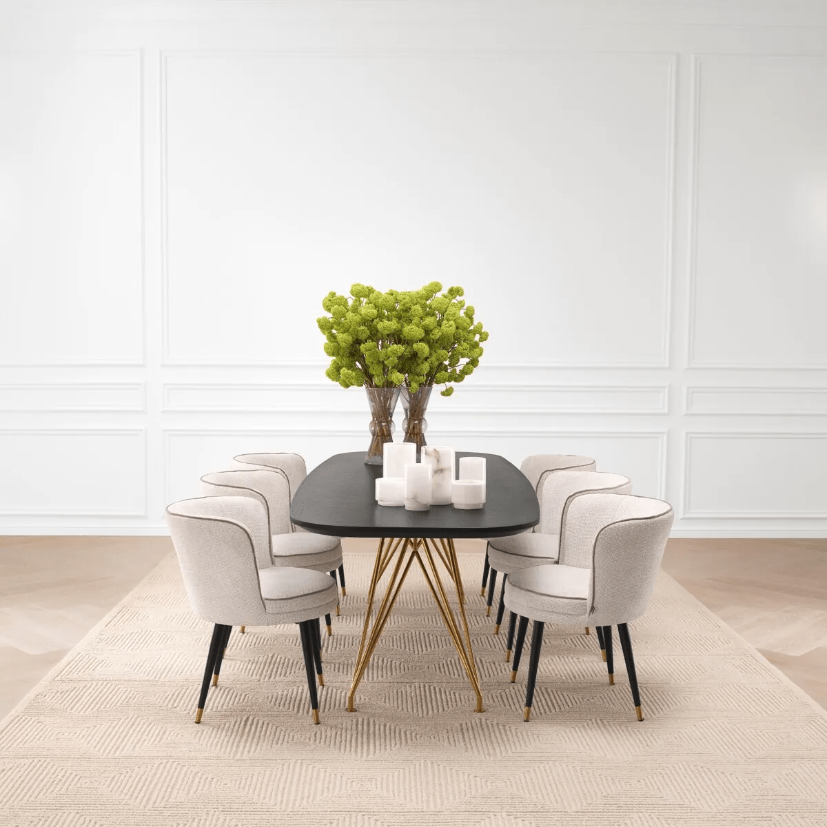 Crafted with meticulous artistry, this table features a charcoal oak veneer that exudes a captivating depth and richness. The brushed brass finish legs add a touch of opulence, accentuating the table’s unique aesthetic. Whether hosting intimate gatherings or lavish feasts, Dining Table Levante will soon become the focal point of your dining space.