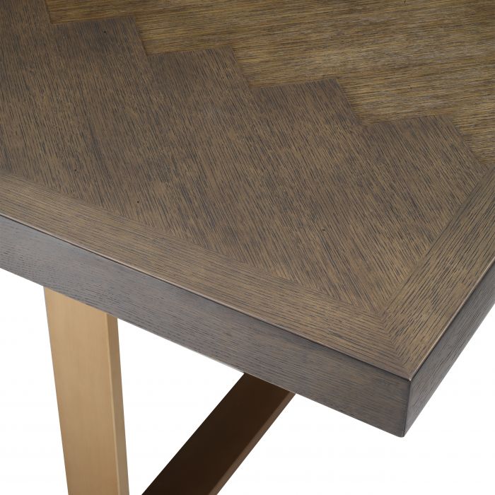 Reminiscent of Danish design furniture from the 1950s, the Melchior Dining Table grants your home interior a genuine retro look and feel. The brown oak veneer tabletop features a beautiful herringbone pattern. It rests on a metal base with brushed brass finish to ensure it effortly blends in a variety of décors.