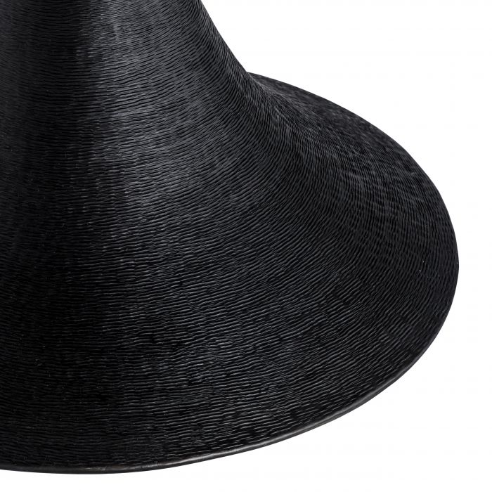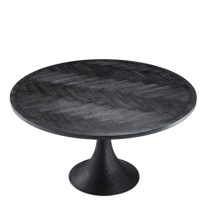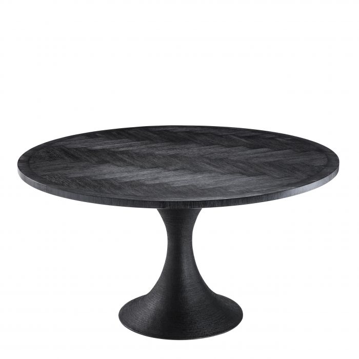 Give your décor Mid-Century Modern appeal with the stunning charcoal oak veneered Melchior Dining Table that features an hourglass-shaped base with a bronze finish. As the beautiful herringbone pattern of this round dining table shows, veneers are very suitable for marquetry. High-quality veneer lasts longer than solid wood which warps or cracks over time.