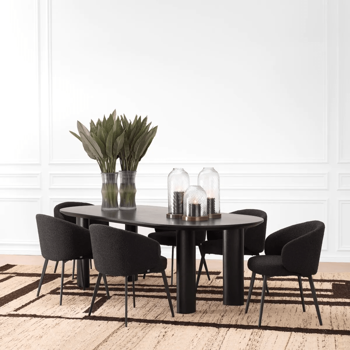 Featuring a captivating black veneer that emanates an air of contemporary allure and sophistication, its semi-round shape effortlessly blends style and functionality to create an ambiance that is one-of-a-kind. Embrace the exceptional allure of the Mogador Dining Table and redefine your dining experience.