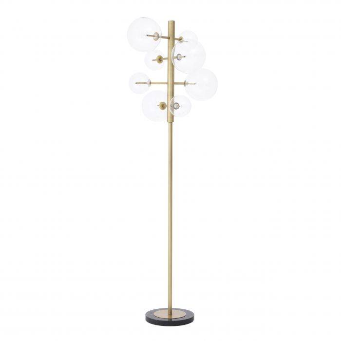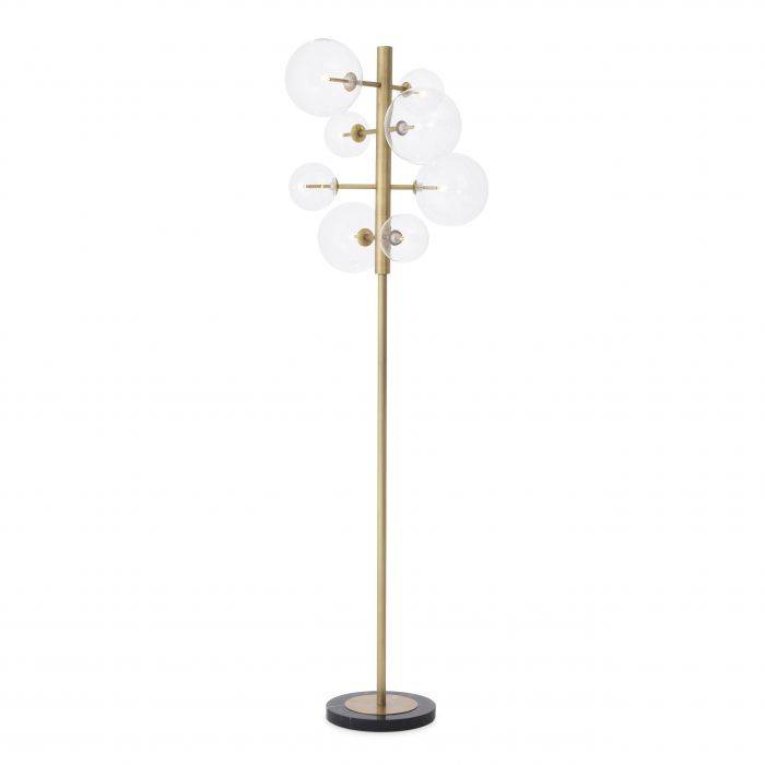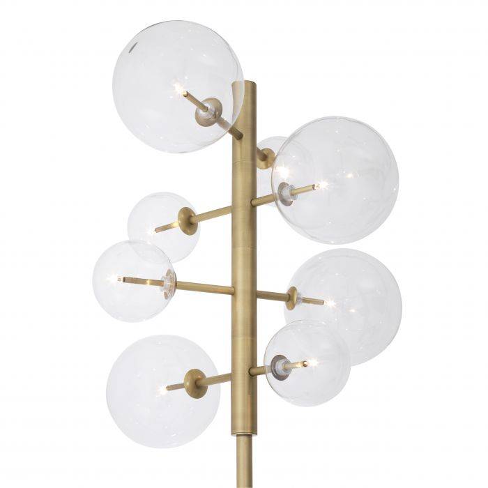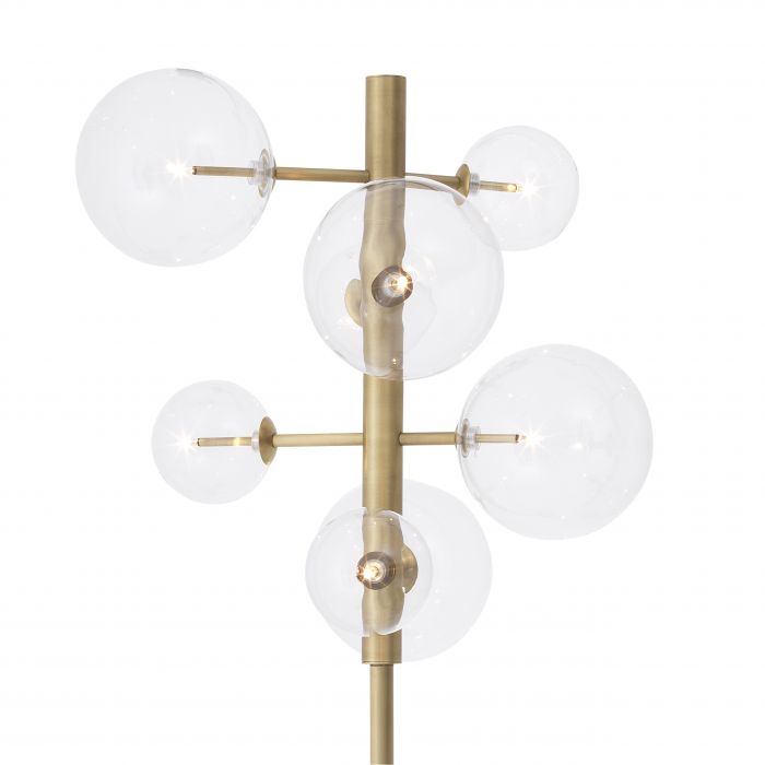 Create a retro-chic focal point in your living space with the Argento Floor Lamp. This beautiful interpretation of Mid-Century Modern designer lighting instantly elevates your room! Resting on a round base of black marble, the antique brass finish fixture contains 8 hand blown clear glass globes. Complement with the matching Argento Chandelier.