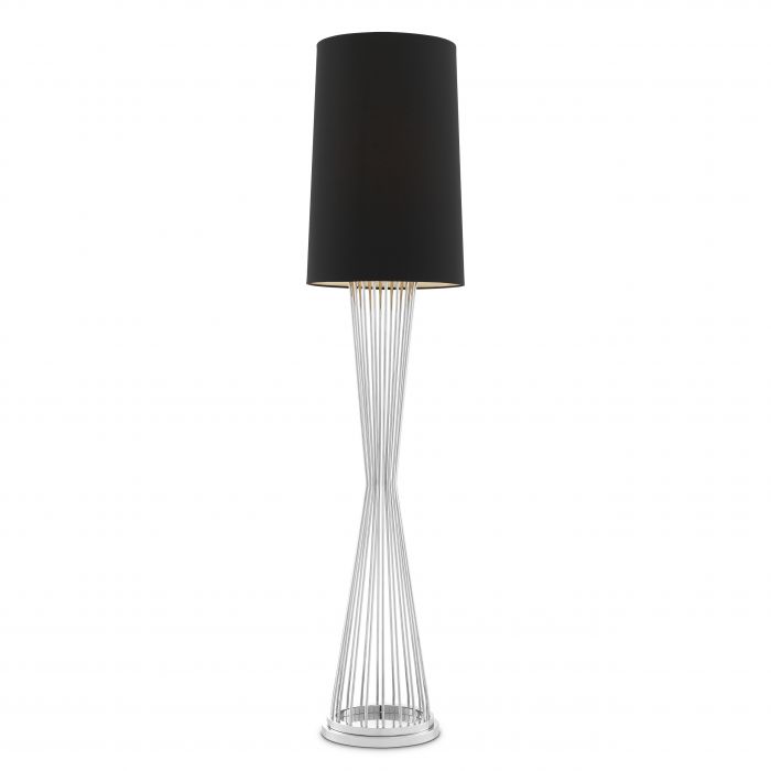 With its sleek hourglass shaped lamp base and structural lines, the Holmes Floor Lamp is designed to stand out in style. The stainless steel open-work fixture features a nickel finish and sports a black lampshade.