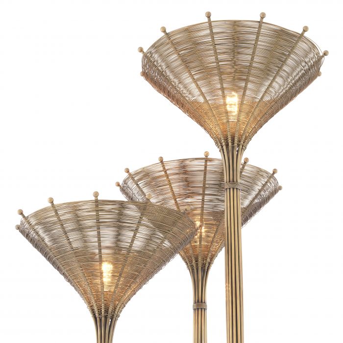 If you are looking for enlightenment, our Kon Tiki Triple Floor Lamp will bring you into higher spheres. This magnificent trinity sheds a divine light in lofty interiors. Its metal fixture with vintage brass finish includes three lampshades with a woven rattan look.