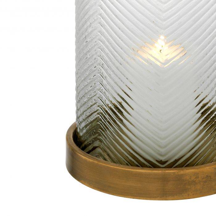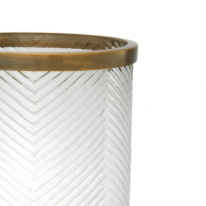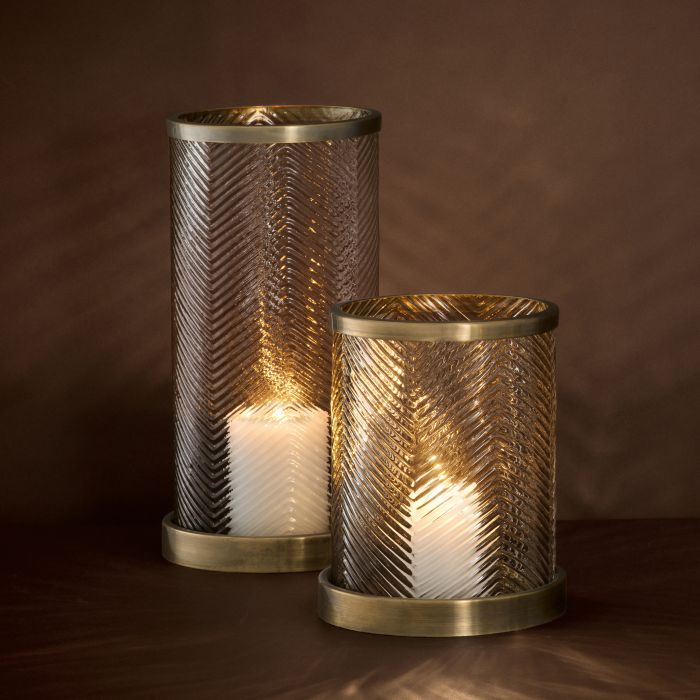 Enlighten your home décor with the exquisite Hurricane Paloma L. Hand blown by skilled glass artisans, this vintage style candle holder features a cylindrical jar from ribbed cut glass and a base and rim in antique brass.
