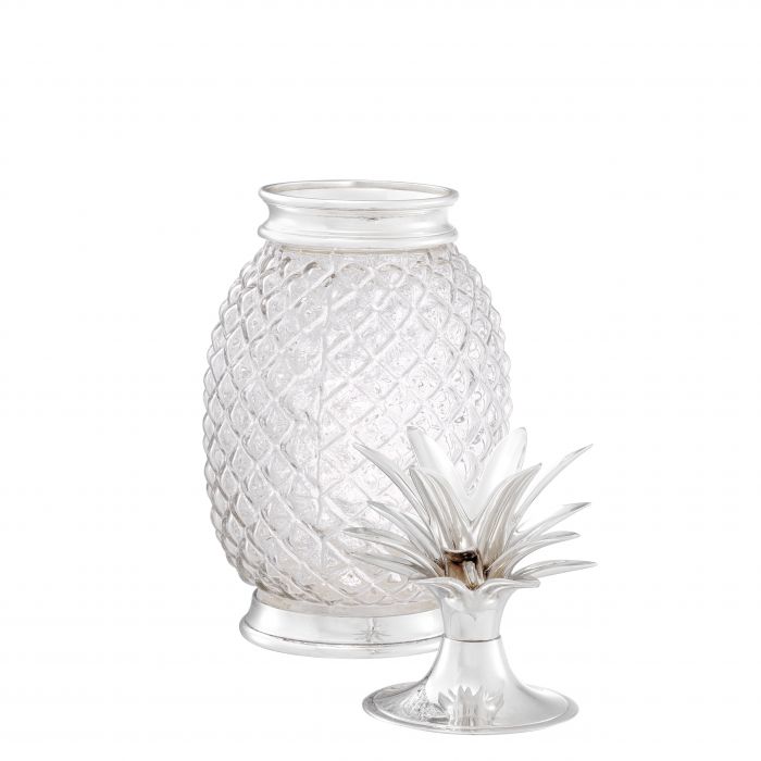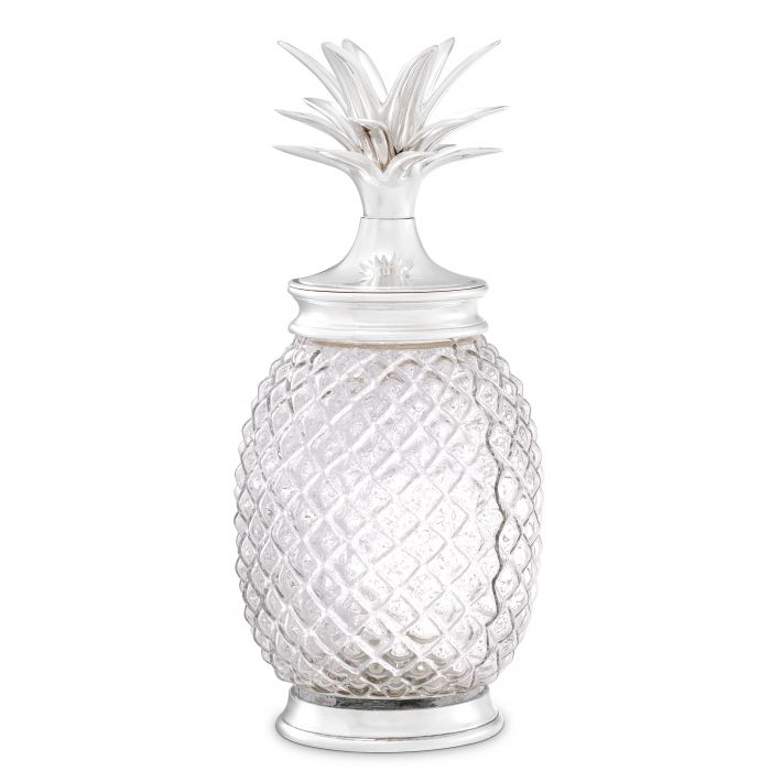 Add a tropical touch to your interior with the sophisticated Hayworth Jar. This elegant pineapple container is made of glass and has a silver-plated crown and base. Both a dramatic accent and a handy storage pot.