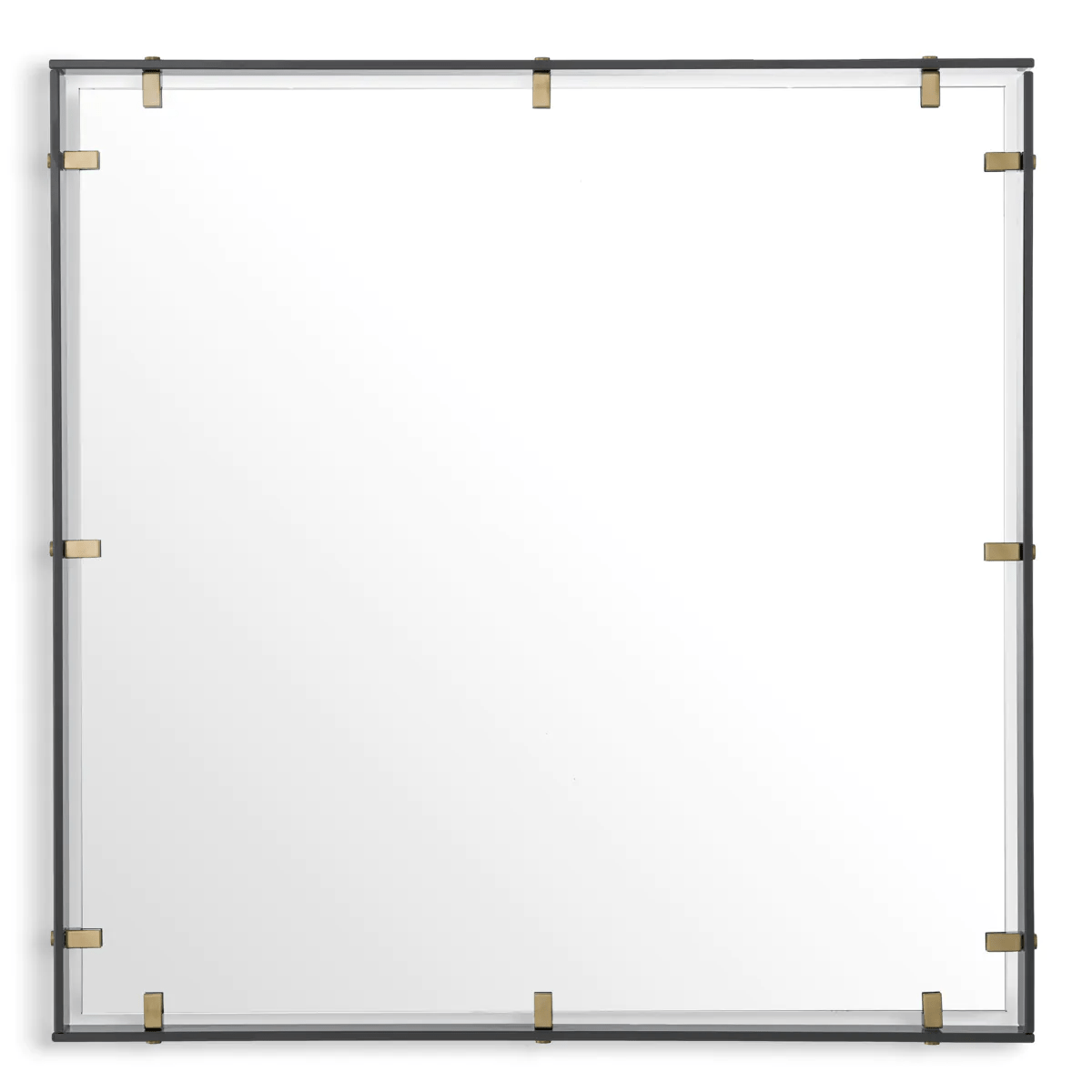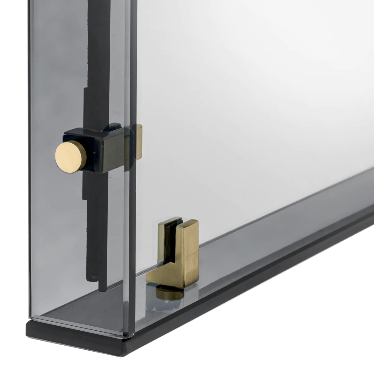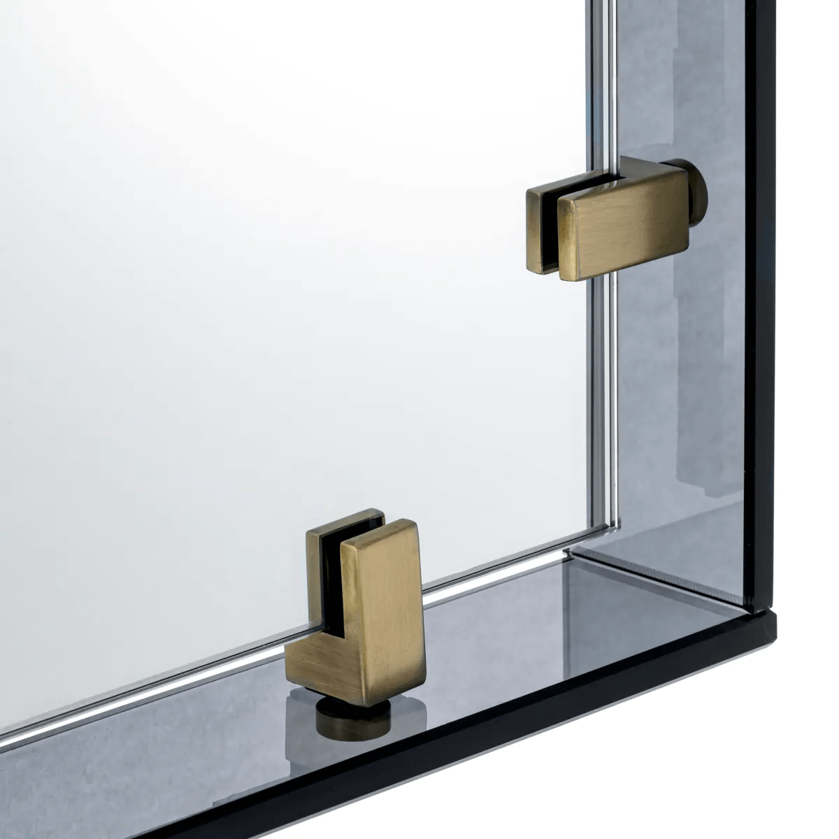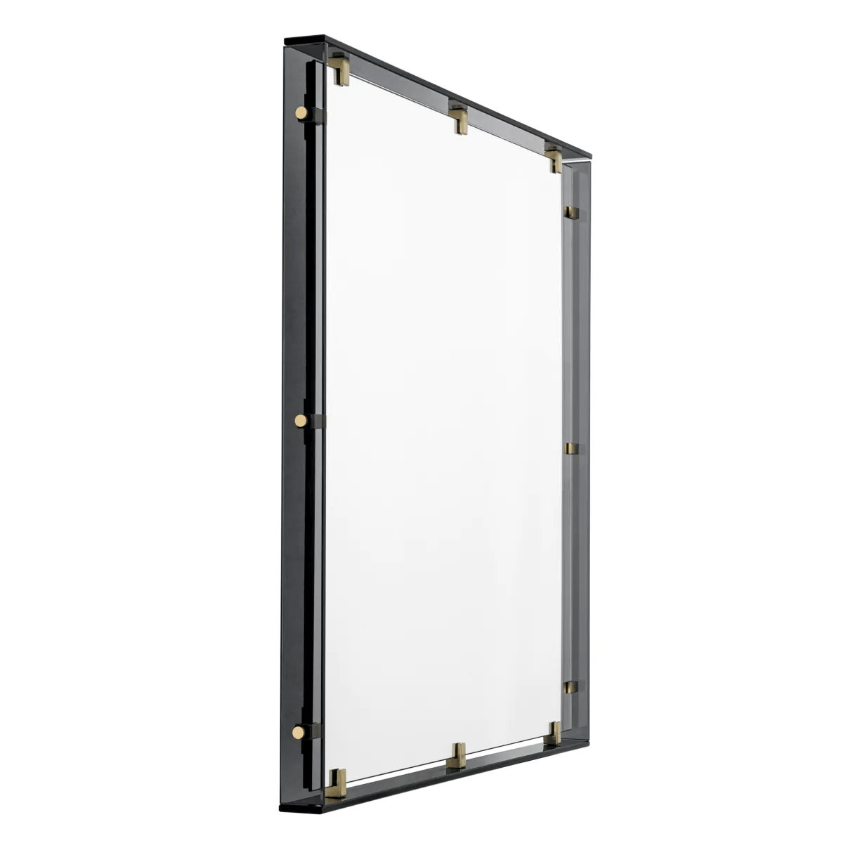 Sleek and sophisticated, the medium size Verona Mirror exemplifies contemporary style with a silhouette made of mixed materials arranged into a distinctive form. The rectangular smoked glass frame features antique brass accents that gleam in the soft light as they extend from the frame to uphold the mirror.