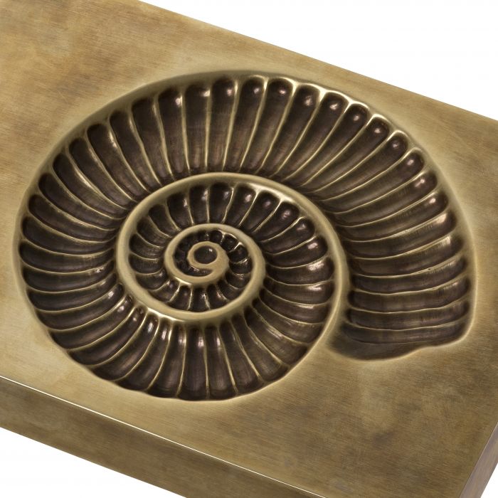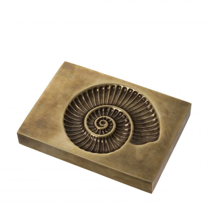 Channel nautical style into your home with the intricate Contra Object. This artsy object with vintage brass finish has the imprint of a Perisphinctes ammonite fossil. Ammonites were prehistoric marine animals with a coiled shell. They became extinct at the end of the Cretaceous period, about 66 million years ago, at roughly the same time as the dinosaurs disappeared.