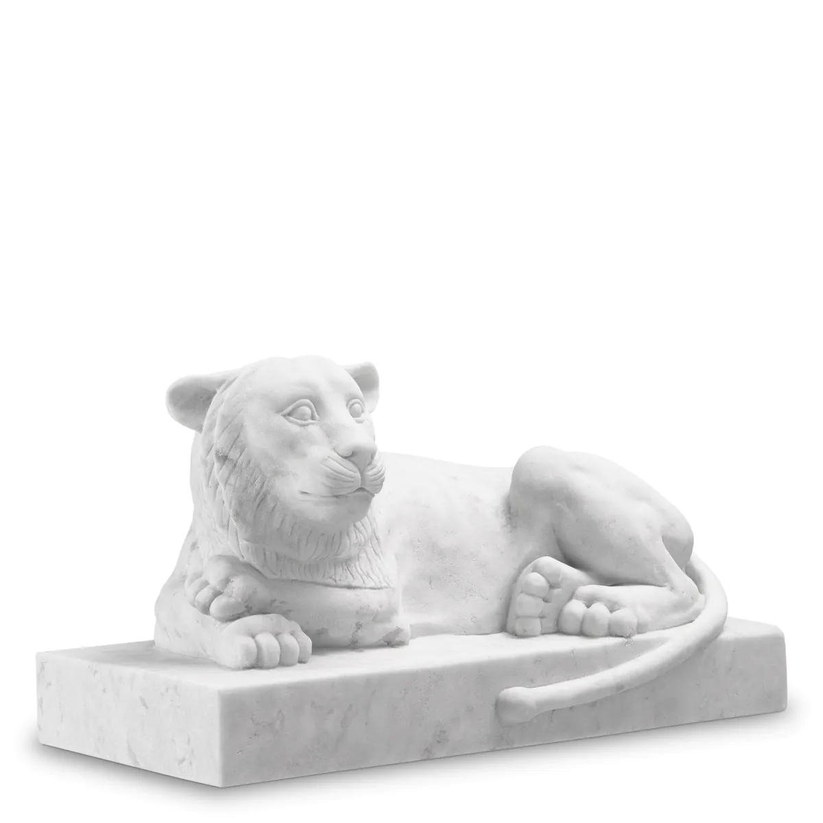 The Object Reclining Lion is a recreation of a Ptolemaic- or Roman-period Egyptian sculpture of a reclining lion (332 B.C.–A.D. 364) at The Metropolitan Museum of Art in New York. Originally carved from limestone, the lion seems at rest yet alert with its large, placid head facing the viewer. It is known that pairs of lions such as this one might have flanked the entrances to ancient temples. Lions were associated with royalty, and suggested powerful protective forces over temples and gods. This reinterpretation has been exquisitely handcarved in white marble, affording each piece a unique color and natural veins. The sculpture rests on a white marble plinth.