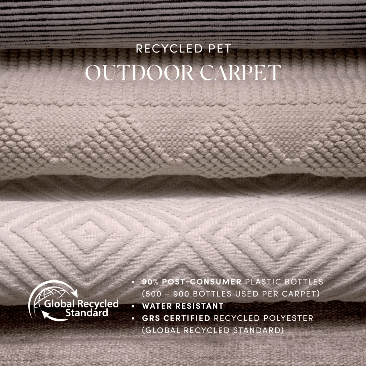 The recycled polyester yarns are known for a fast-drying time and durability. The perfect feature for water resistant outdoor carpets.