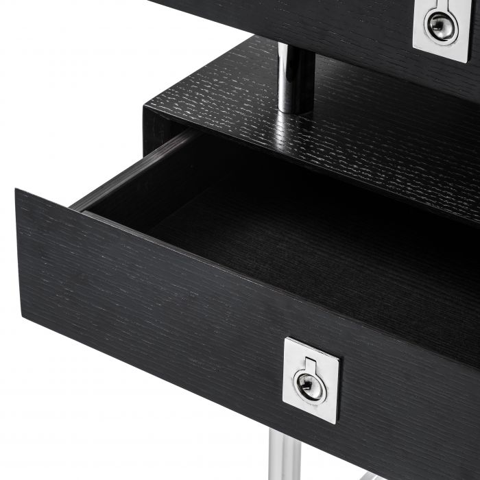 Inspired by the clean lines of Bauhaus design, the Bedini Side Table brings a feeling of luxe modernity to your home décor. With its polished stainless steel frame and black oak veneer top and drawer, it’s a perfect side table for sofas and a marvellous nightstand.