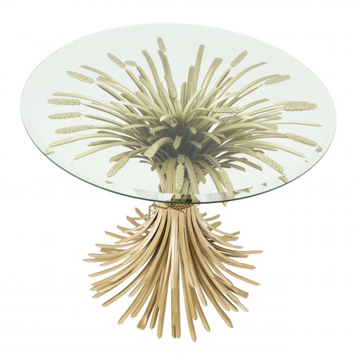 Sculpted from iron in an antique gold finish, the dazzling Bonheur Side Table ø 90 cm includes a sheaf-shaped base and a bevelled clear glass tabletop. Originally a symbol of prosperity and hospitality, the sheaf signifies one has worked hard and is now enjoying the good life.