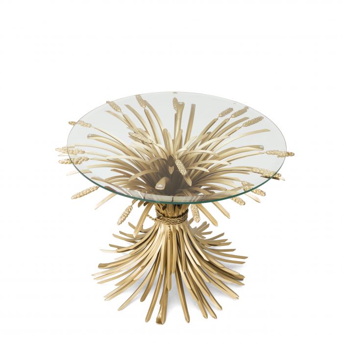 Sculpted from iron in an antique gold finish, the dazzling Bonheur Side Table ø 80 cm includes a sheaf-shaped base and a bevelled clear glass tabletop. Originally a symbol of prosperity and hospitality, the sheaf signifies one has worked hard and is now enjoying the good life.
