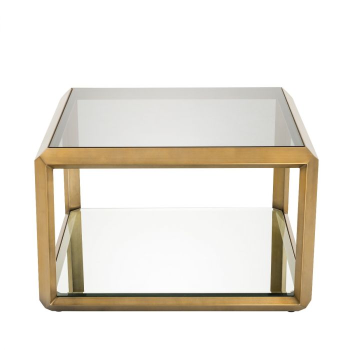 Evoke the seductive style of the seventies with the decadent Callum Side Table. Its brushed brass frame with bevelled rims surrounds the tabletop of smoke glass and the bottom shelf of mirror glass. Whether you are going for a retro or contemporary look, this stylish side table will be a perfect choice.