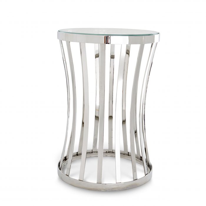 Bring ultra-chic flair to your ensemble with the glamorous Chilton Side Table. This eye-catching guéridon is the perfect addition to your modern aesthetic. Featuring a rounded, openwork hourglass silhouette, this polished stainless steel side table with clear glass tabletop exudes high class.