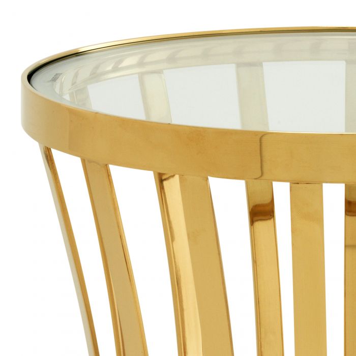 Bring ultra-chic flair to your ensemble with the glamorous Chilton Side Table This eye-catching guéridon is the perfect addition to your modern aesthetic. Featuring a rounded, openwork hourglass silhouette, this gold finished side table with clear glass tabletop exudes high class.