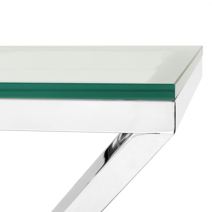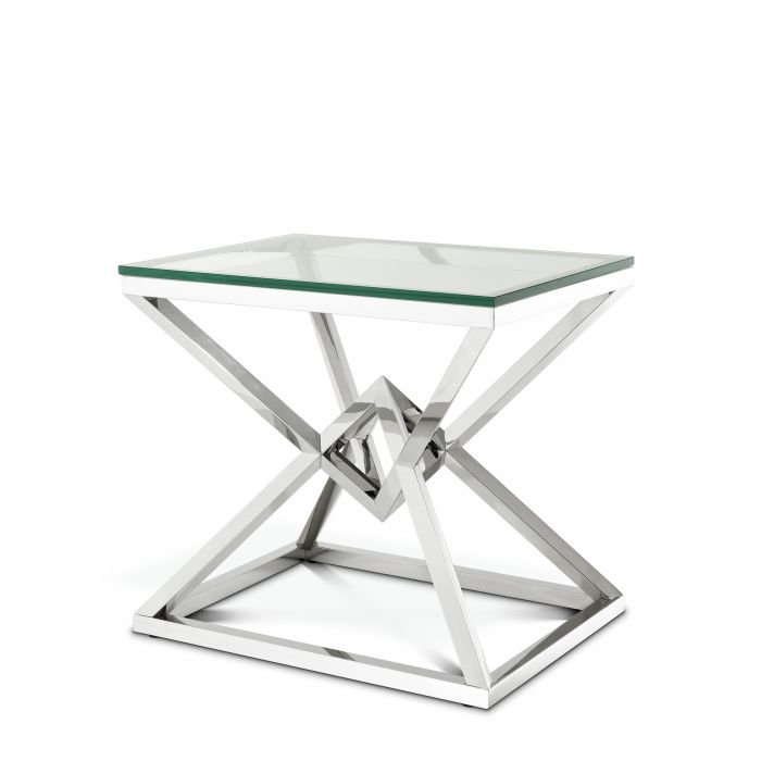 Discover the versatility of the Connor Side Table. With its shiny pyramid base, this designer table adds radiance and splendour to your home décor. Crafted from stainless steel, the conspicuous geometric base features a polished finish and a clear glass tabletop.