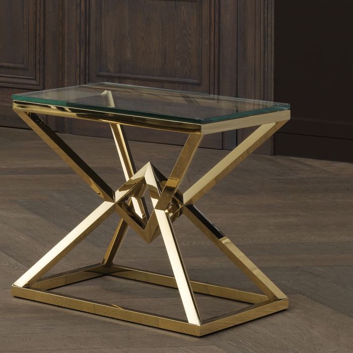 Discover the versatility of the Connor Side Table. With its shiny pyramid base, this designer table adds radiance and splendour to your home décor. Crafted from stainless steel, the conspicuous geometric base features a glamorous gold finish and a clear glass tabletop.