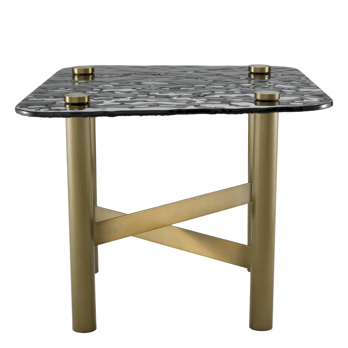 The textured smoke glass top adds a touch of sophistication, while the brushed brass finish on the base provides a luxurious and modern look. With its unique design and high-quality materials, the Eichholtz Side Table Cortes is a perfect addition to any stylish living space.