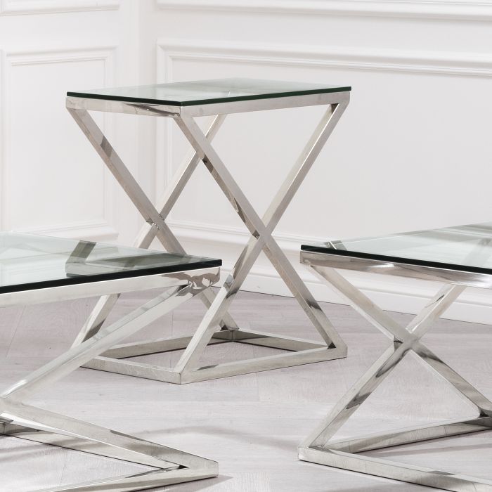 Add a trendy edge to your home interior with the voguish Criss Cross High Side Table. This chic furniture piece comprises a stainless steel frame with a polished finish and comes with a rectangular clear glass tabletop.