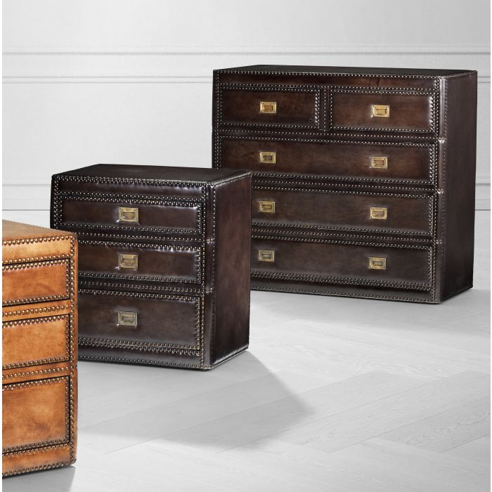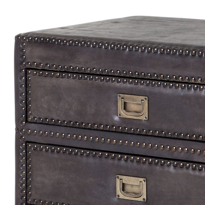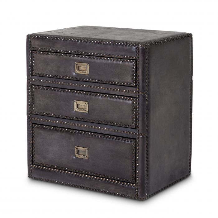 The gorgeous Flemming Side Table is presented in a gunmetal leather upholstery finish. It features three pull-out drawers with antique brass handles.