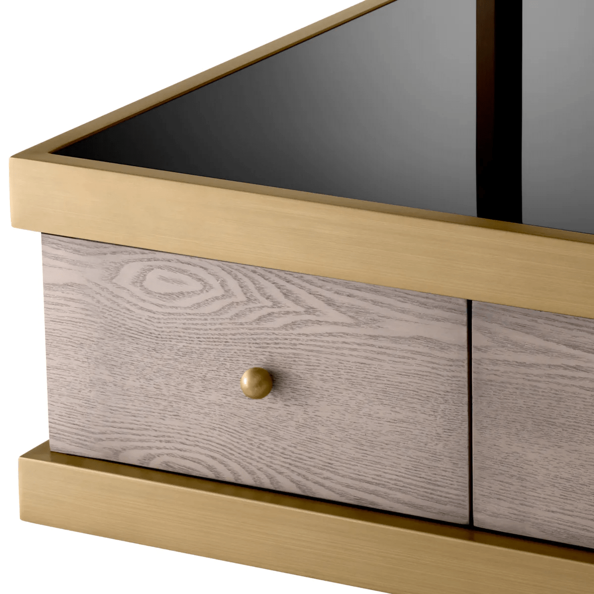 Crafted with a brushed brass finish, the grey oak veneer provides a warm and inviting element, while the black glass top adds a striking contrast and a contemporary flair to this rectangular table. Featuring two drawers, the Kuboa Side Table harmoniously blends style and functionality.