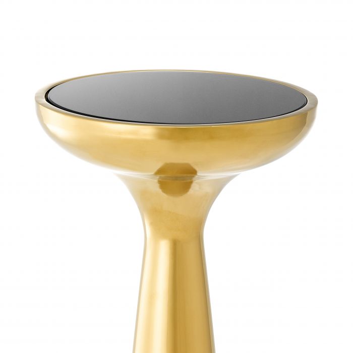 The organic shaped high Lindos Side Table takes style cues from mid-20th-century Scandinavian design furniture. This stunning round end table features a stainless steel base in gold finish and a black glass tabletop.