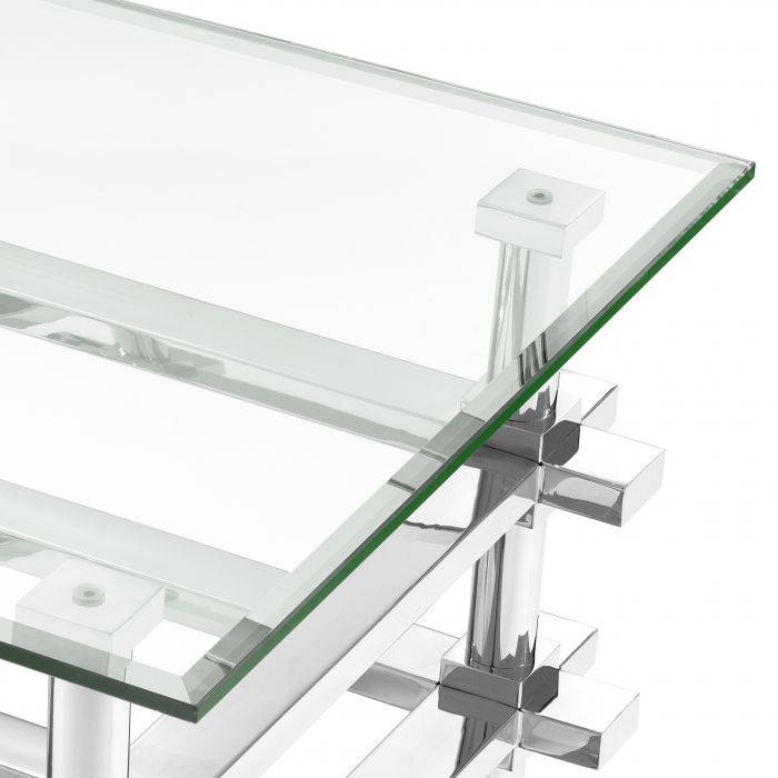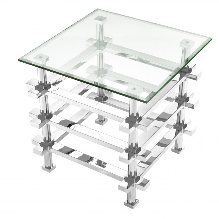 The Madagascar Side Table is supported by four vertical columns, combined to form a symmetrical base. Comprised of polished stainless steel, the base supports a square tabletop of bevelled clear glass that provides a clear view of the architectural structure below.