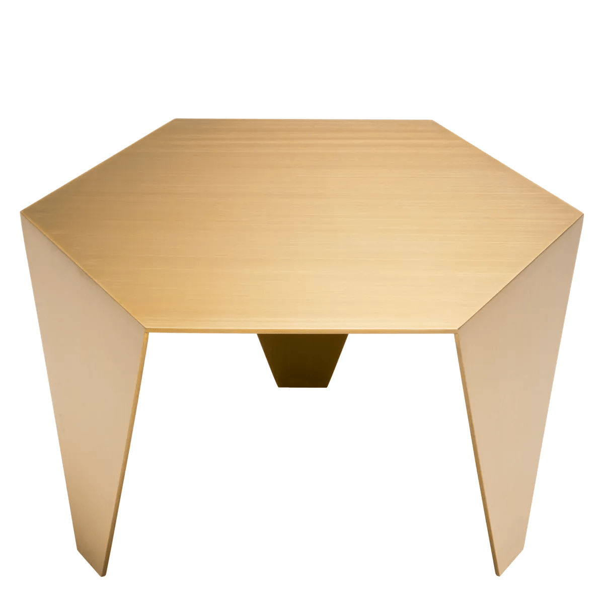With a hexagonal table top and three tapered legs in a brushed brass finish, the Metro Chic Side Table adds a geometric accent to your living room interior.