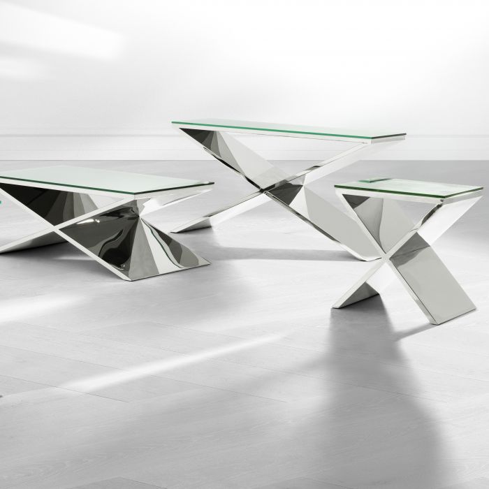 The clean-lined shape of the Metropole Side Table will always satisfy. With its impressive X-shaped base of polished stainless steel and clear glass tabletop, this modern side table proves that the greatest ideas are often the simplest.