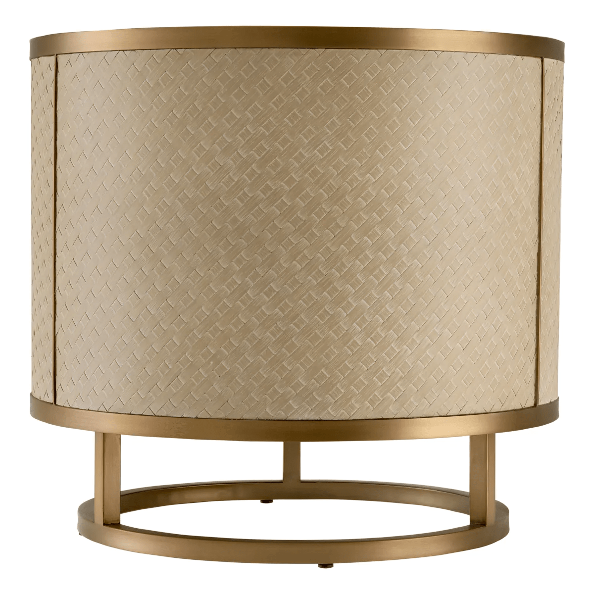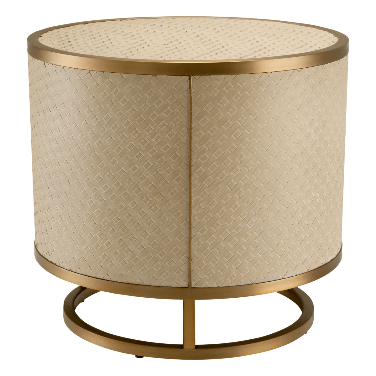Lined with woven washed oak veneer and accentuated by a brushed brass finish frame and hardware, this classy furniture works with many interior styles.