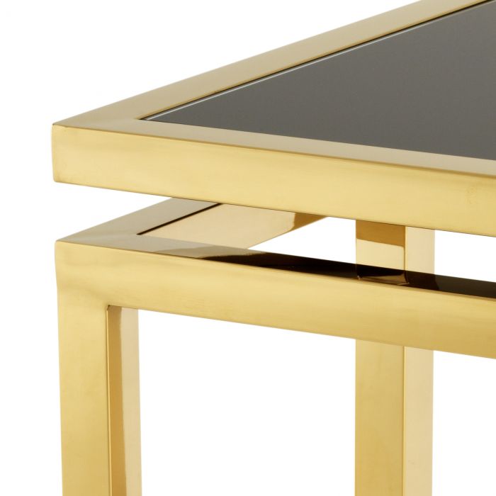Relive the unmatched grandeur of the Art Deco era with the first-rate Palmer Side Table. Crafted from stainless steel, it features a glossy gold finish and a tempered smoke glass tabletop. FABULOUS ART DECO SUCCESSORRelive the unmatched grandeur of the Art Deco era with the Eichholtz Palmer series. Each element is an eye catcher, handcrafted with meticulous care by skilled artisans. Combine with luxury lighting and accessories of the Eichholtz collection for a glamorous interior.POLISHED STAINLESS STEEL AND TEMPERED GLASSSolid constructions of stainless steel, finely finished and highly polished, with tempered smoke glass tabletops.