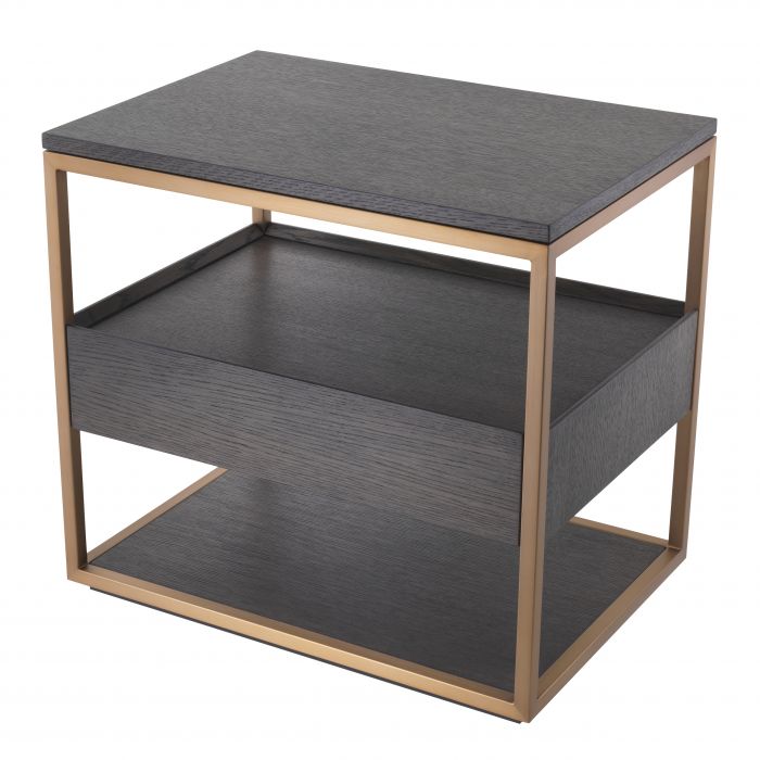 With a metallic frame in a brushed brass finish and a top, body and lower shelf of mocha straight oak veneer, this chic side table features a modern design with a retro twist that elevates the space around it. Including one drawer, it is also well-suited to a dining area or bedroom.