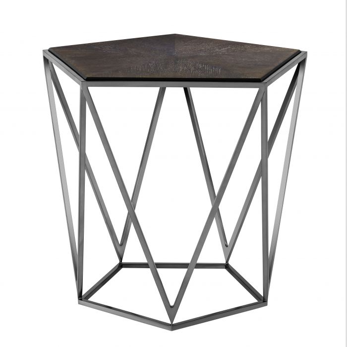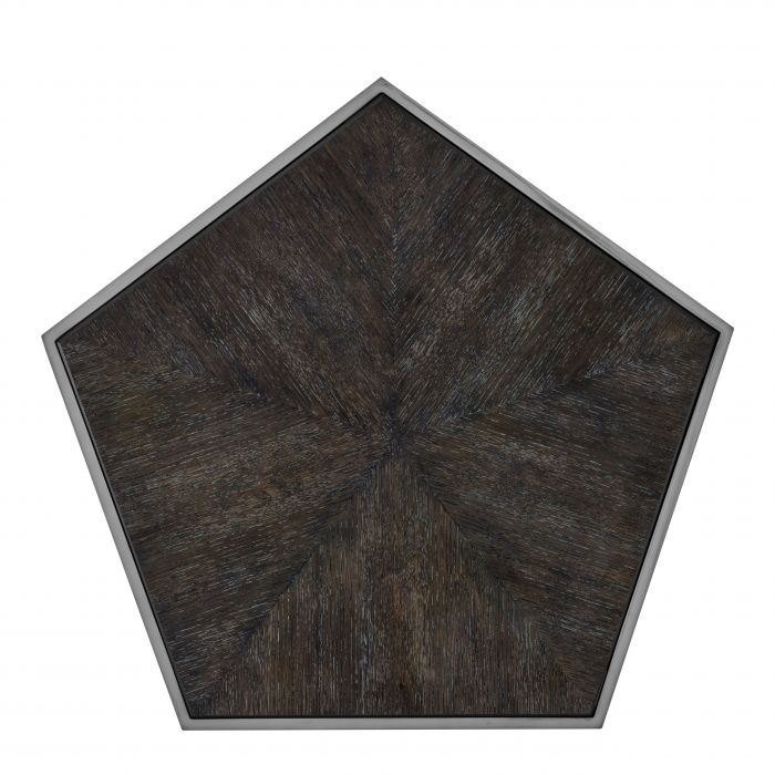 Grant your living area a voguish vintage feel with the Pentagonal Side Table. Its tapered triangular frame features a black nickel finish, while its charcoal oak veneer tabletop is beautifully inlaid in a three-cornered pattern.