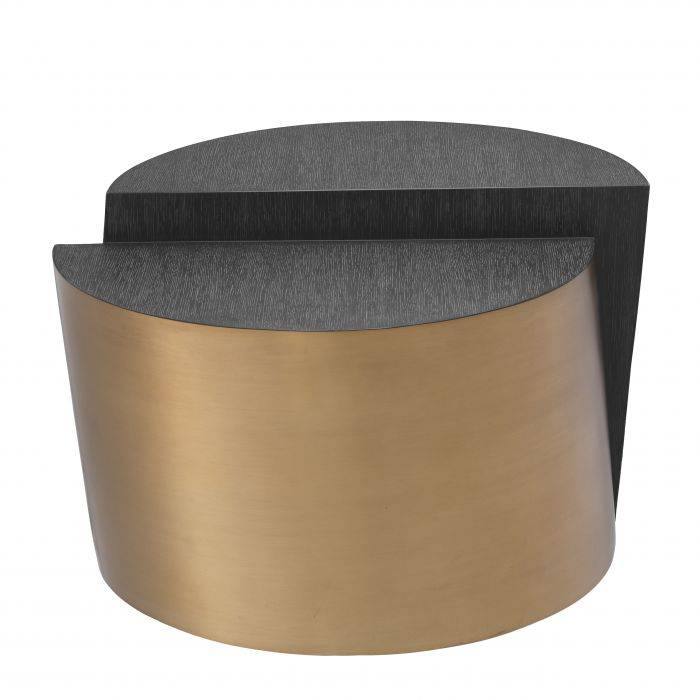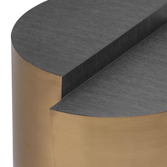Designed with elegance in mind, the Riviera Side Table makes a stunning style statement in your abode. Crafted from metal in a brushed brass finish, this contemporary end table showcases a split drum shape with 2 half-round surfaces of charcoal grey oak veneer. The warm metallic finish of the base counterpoints the dark tone of the tabletops with striking effect.