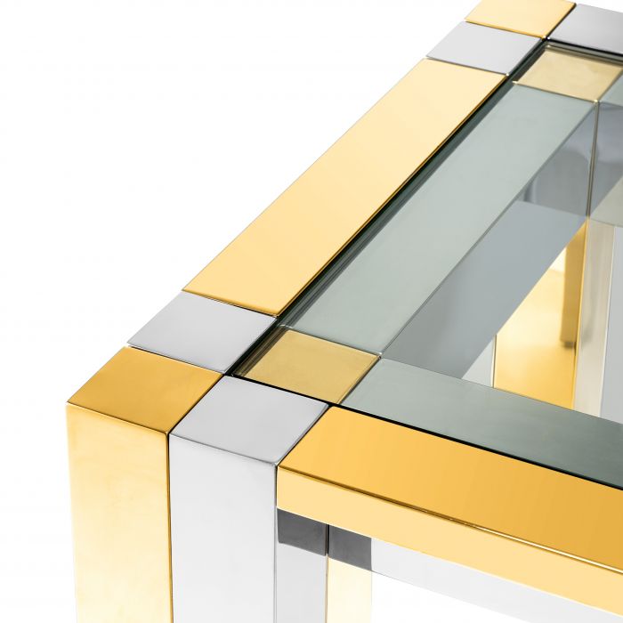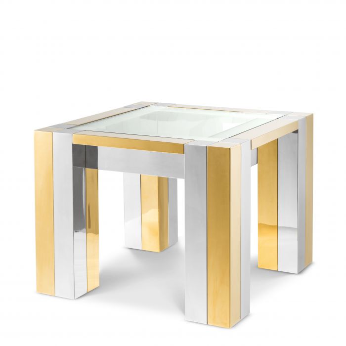 Pairing silver and gold tones in a sturdy steel frame, the Titan Side Table is the perfect blend of glamour and simplicity. With its seductive geometric base and clear glass tabletop this splendid piece will add a crisp and alluring aesthetic to your living space.