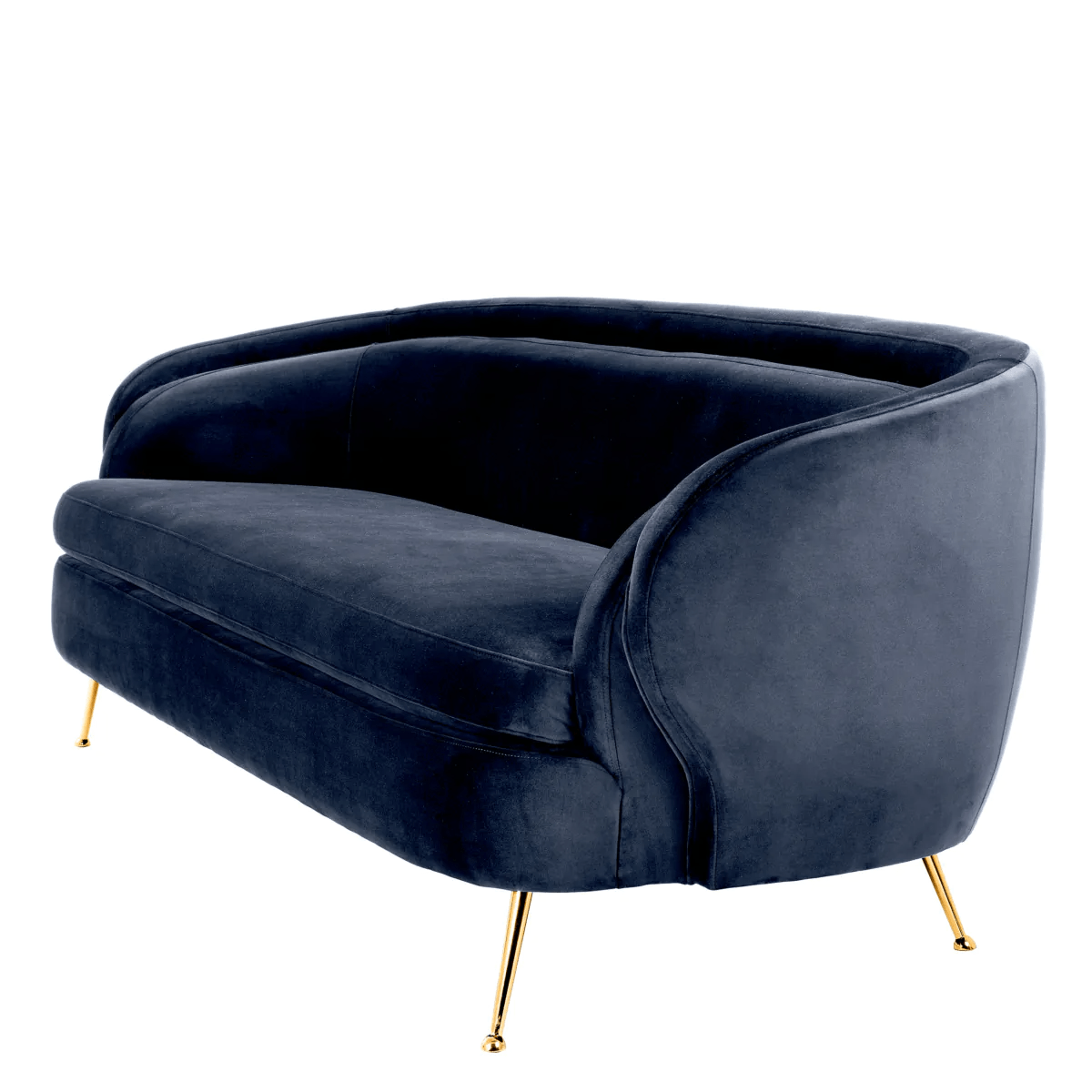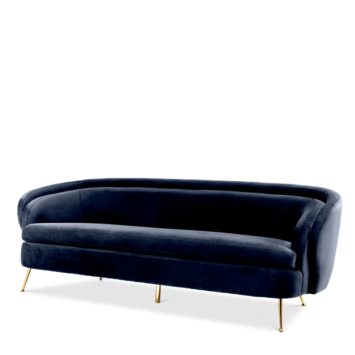 This attractive couch brings a splash of retro style to your home interior. Its clean lines and soft curves contribute to its Mid-Century Modern look, while its Savona midnight blue velvet upholstery and tapered brass legs round out the design.