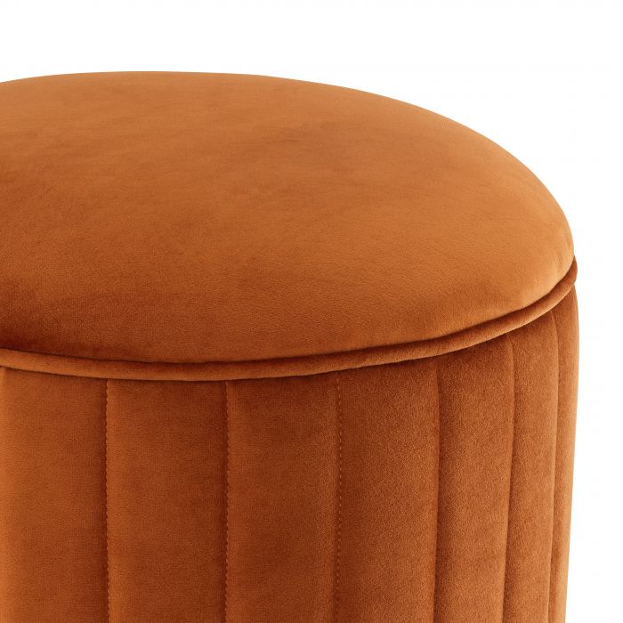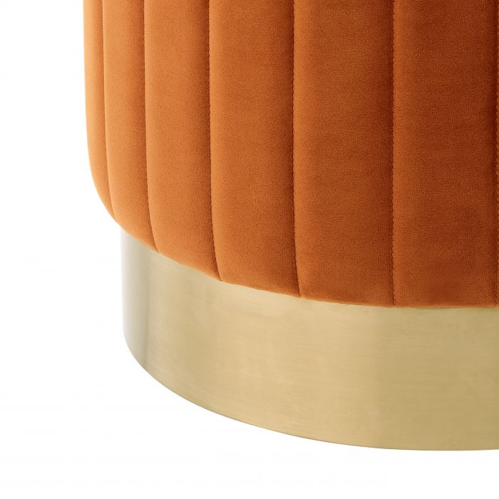 Beautify your living room or bedroom by incorporating the Roaring Twenties appeal of the Allegra Stool into your décor. This lovely round vanity stool features a Roche orange velvet upholstery and brushed brass base. The padded casing showcases a low relief geometrical design with parallel vertical lines, creating a stunning Art Deco look.