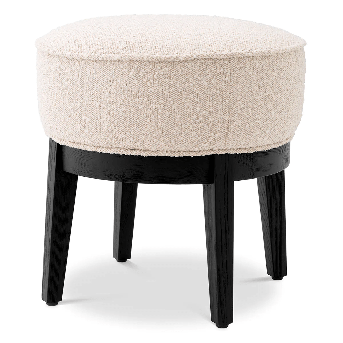 The black finish wood frame has 4 legs and the seat is covered in Bouclé cream, a lush looped fabric. This round stool will be right at home in any contemporary décor.