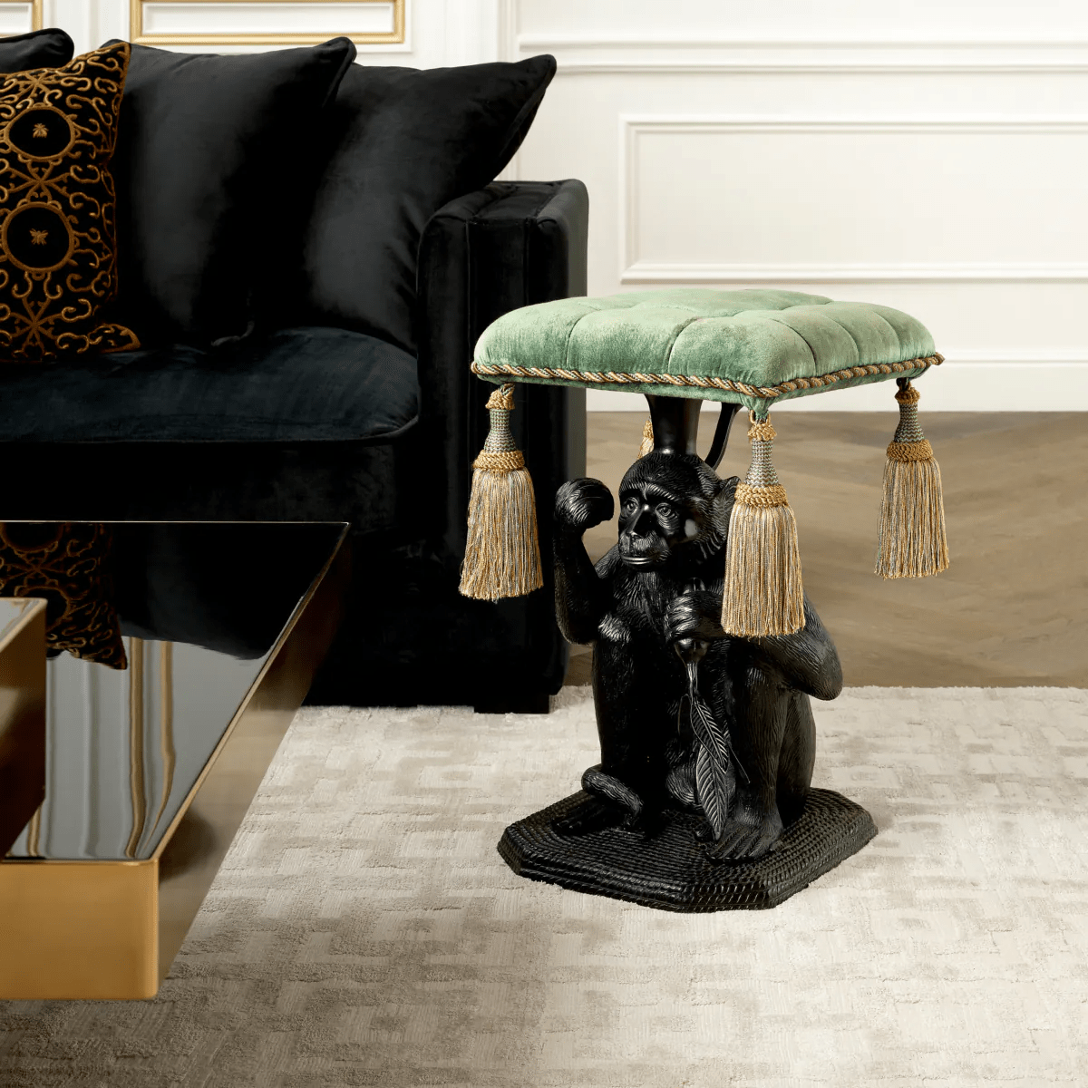 The monkey sculpture with black finish supports a turquoise velvet seating with silk tassels.