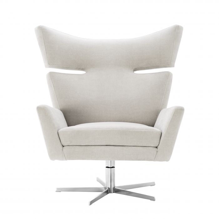 With its high wing-backrest and seat in Clarck sand upholstery, the Eduardo Swivel Chair is both comfortable and stylish. Crafted from stainless steel with a shiny finish, its base offers a five-footed pedestal design that allows the seat above to swivel.