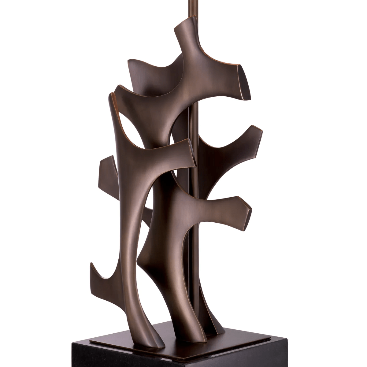 Made of casted brass and provided with a bronze finish, this extraordinary table lamp will add artistic flair to your décor. It features a sculptural body with organic appeal that sits on a black granite base and comes with a rounded square bouclé shade.