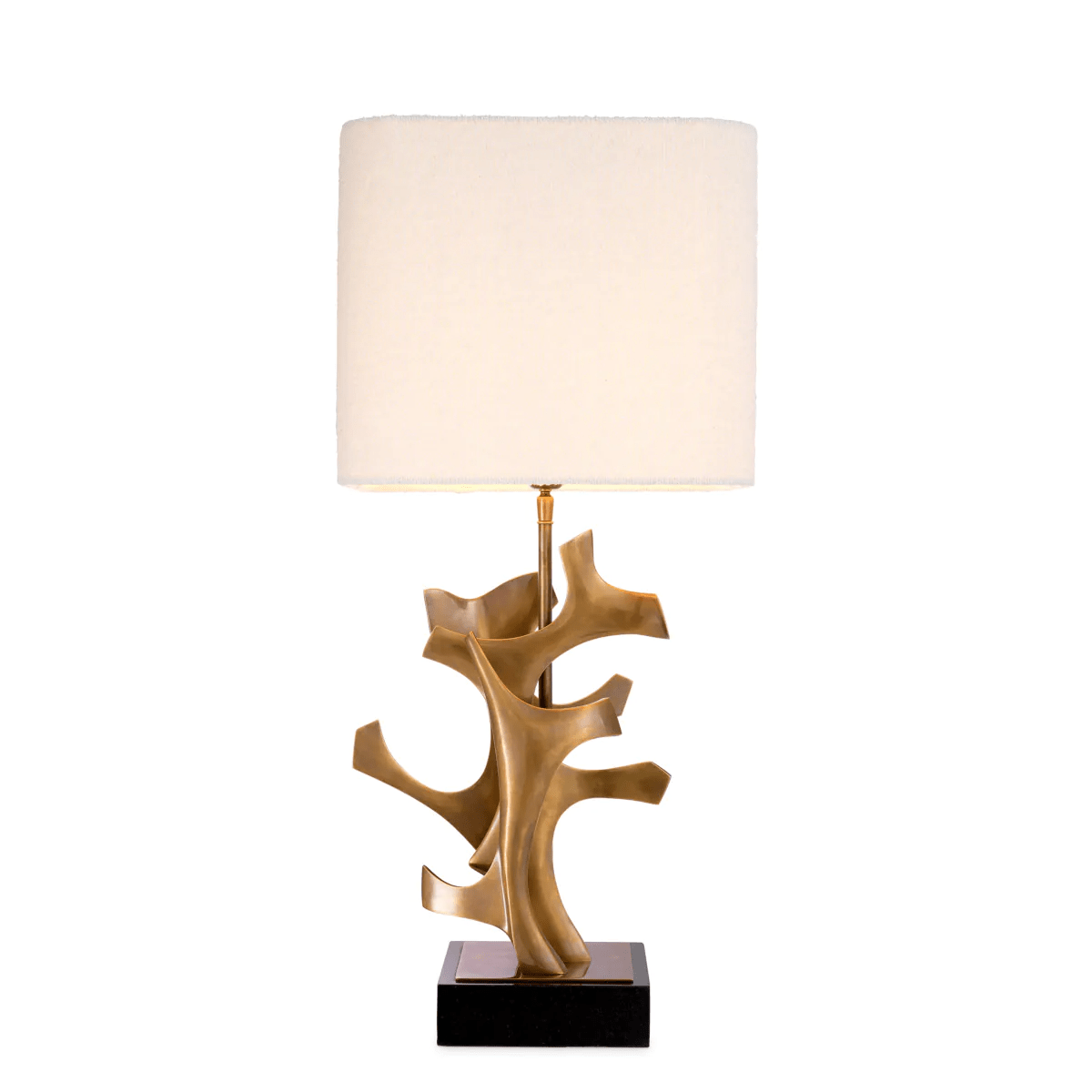Made of casted brass and provided with a vintage brass finish, this extraordinary table lamp will add artistic flair to your décor. It features a sculptural body with organic appeal that sits on a black granite base and comes with a rounded square bouclé shade.