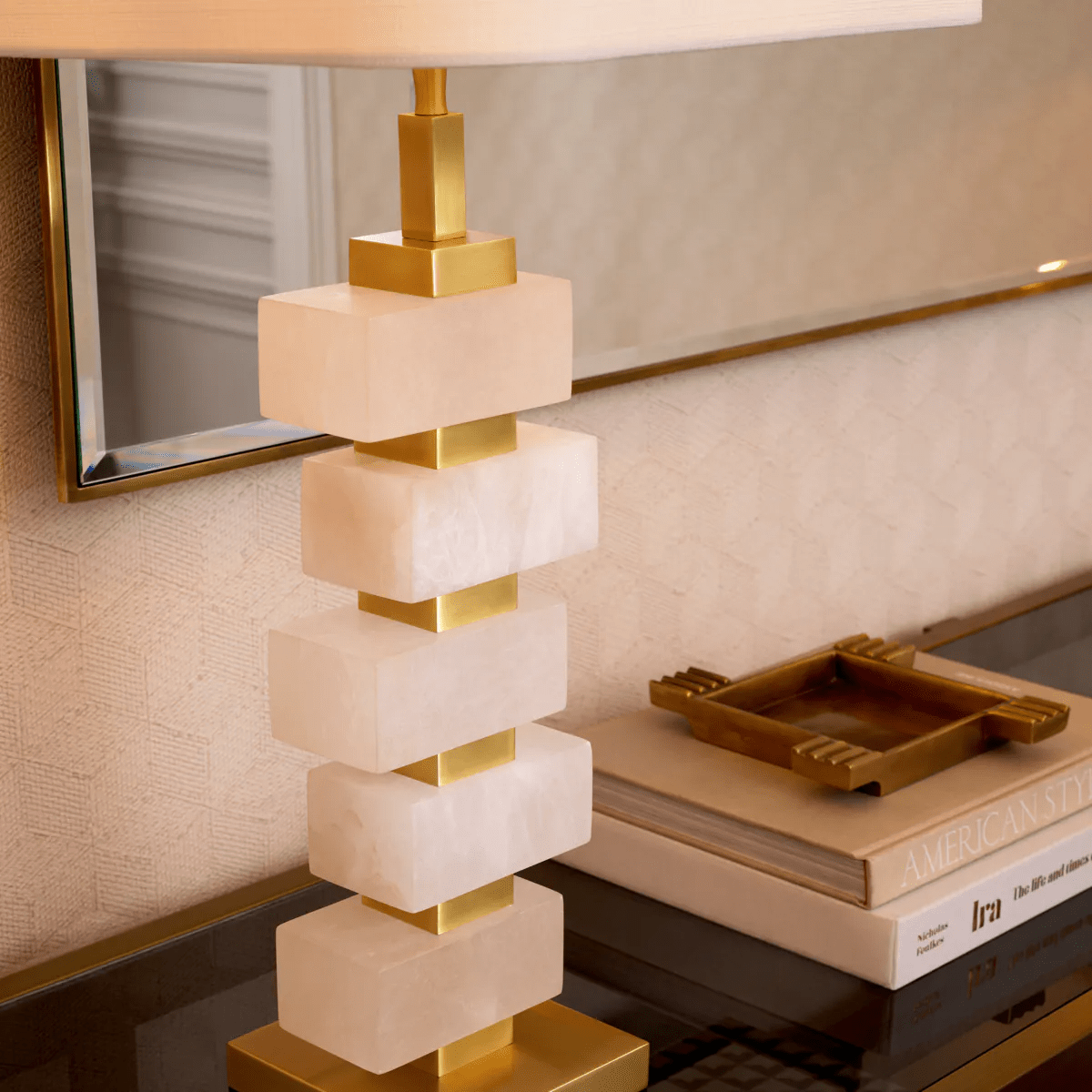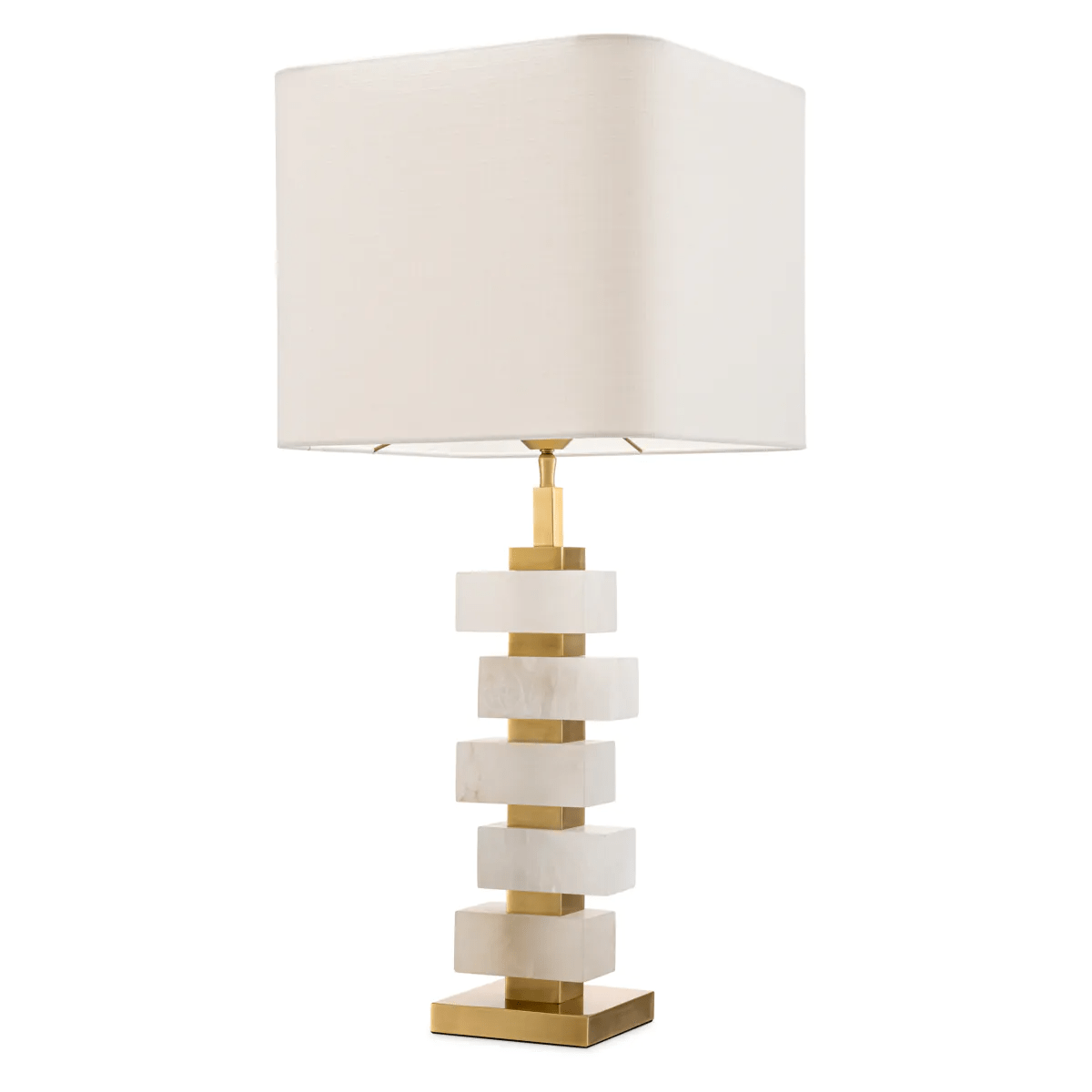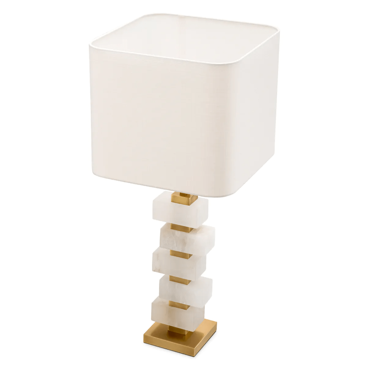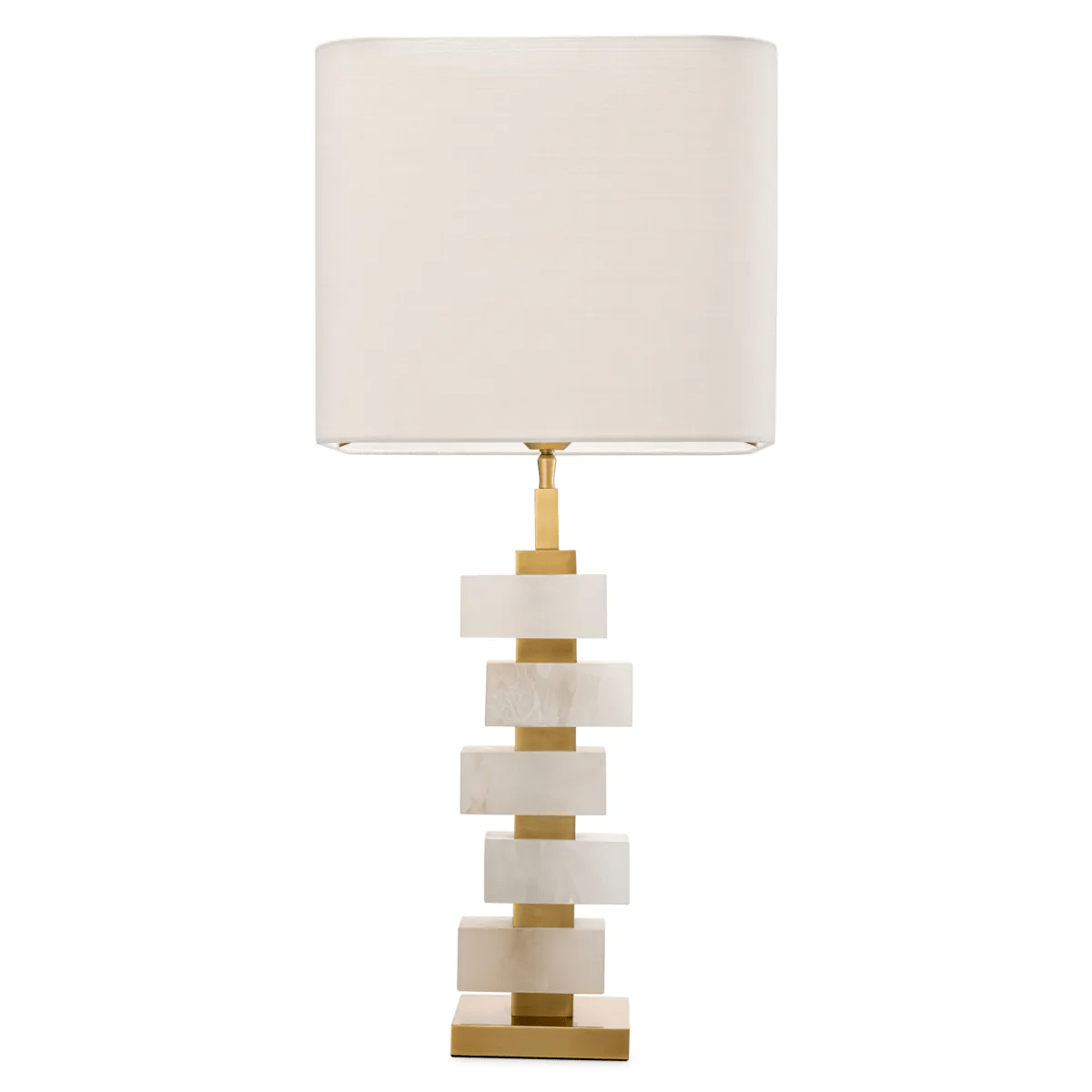 Ideal for nightstands, accent tables, and consoles, Table Lamp Amber is a great way to bring additional lighting to a room or to create ambience by reducing your main light output. The antique brass finish base of this beautiful modern lamp is adorned with blocks of alabaster, and comes complete with an off-white shade.