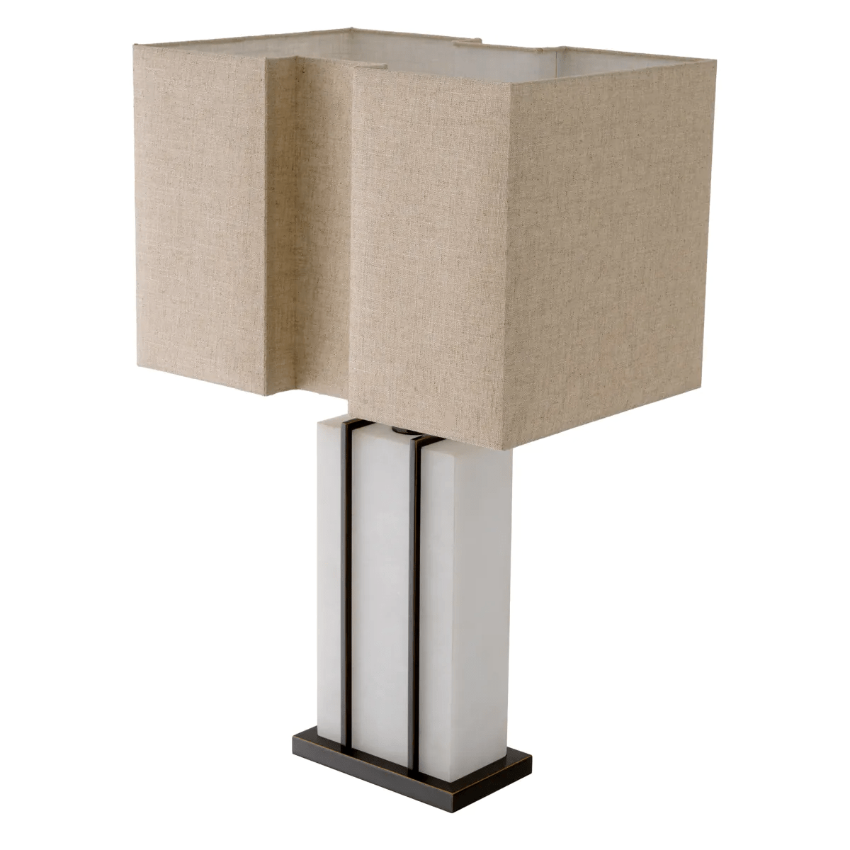 Bring contemporary elegance to your home with Table Lamp Graham. It features an alabaster body in a bronze highlight finish frame and is supplied with a linen mix shade thas has coves on both sides. The translucent alabaster body also contains a lamp socket and creates a really warm ambient light.