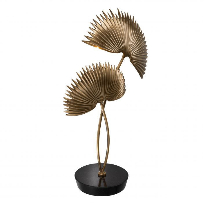 With its intricate detailing, the elegant Hacienda Table Lamp will grant tropical opulence to your interior. The lamp base features 2 polished brass palm leaves on a round black base plinth.