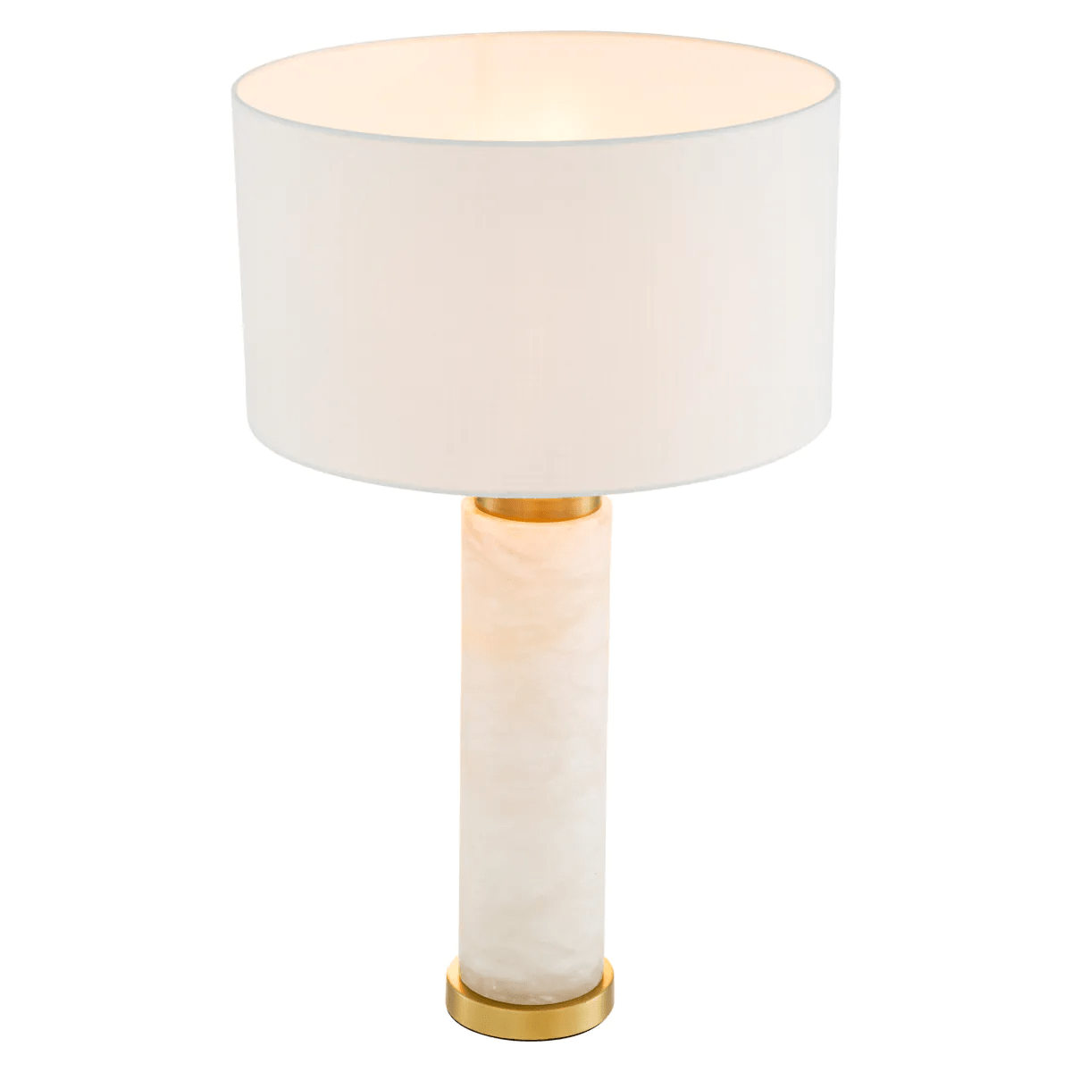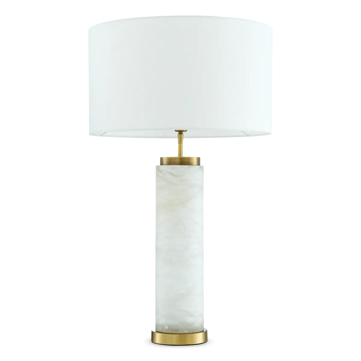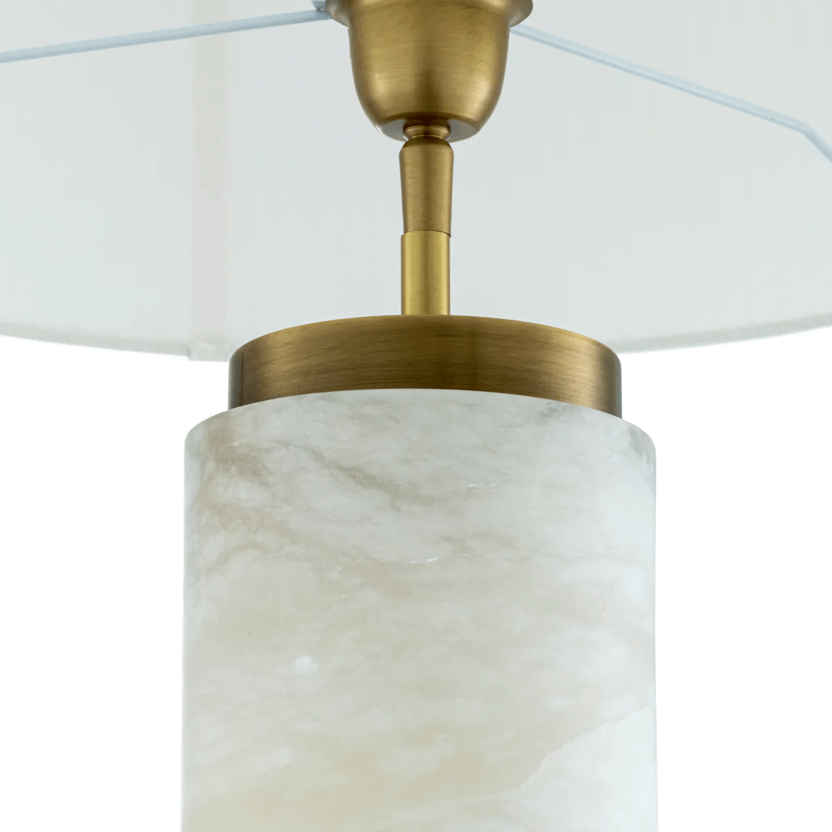 This lovely lamp has a cylindrical body of alabaster and a base and socket with antique brass finish. It is completed with an off-white drum shade to suit all décors. Ideal for hallways, living rooms, dining areas, bedrooms and more.