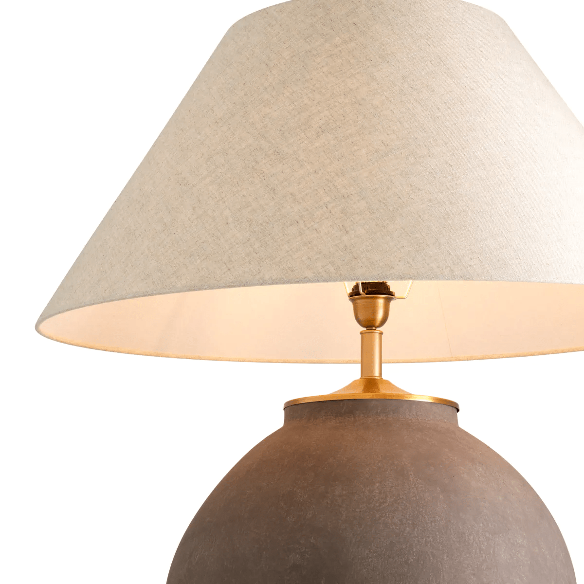 The Table Lamp Moon Jar is inspired by an 18th-century Korean porcelain moon jar—named for its softly curved form and milky-white color—in the collection of The Metropolitan Museum of Art in New York. Moon jars, which were popular in the 18th and 19th centuries during the Joseon dynasty (1392–1910), were typically crafted in two halves and then joined by hand. The moon jar that inspired this lamp has, in some spots, turned a light peachy color as part of the firing process. These imperfections recall the beauty of nature. The Table Lamp Moon Jar has a taupe finish with brushed-brass detailing and a linen-mix shade handcrafted in the Netherlands.”